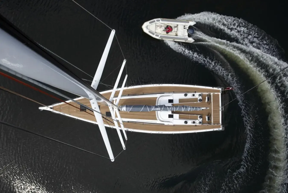 The deck and cockpit layout carefully mixes performance features with cruising comfort. With respect to the latter, you’ll find attractive natural teak decking, a capacious dinghy garage and a handy fold-down transom, not to mention a very clever fold-away cockpit table that disappears into the cockpit sole when not needed. As to the former, you’ll find a battery of nicely oversized Harken Performa winches, full Harken hydraulics for controlling the vang and backstay tension, and a standard belowdeck Harken headsail furler forward.
